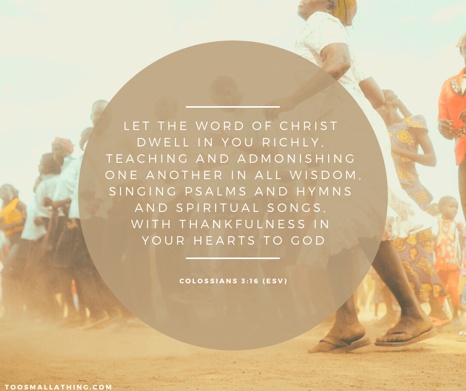 “Let the word of Christ dwell in you richly, teaching and admonishing one another in all wisdom, singing psalms and hymns and spiritual songs, with thankfulness in your hearts to God.”